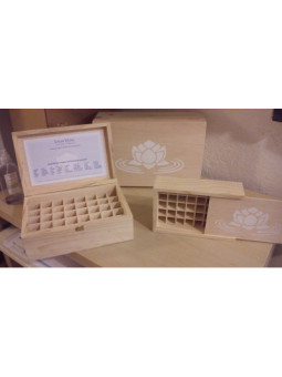 Caja de madera con cierre, compartimentos y leyenda para las esencias.